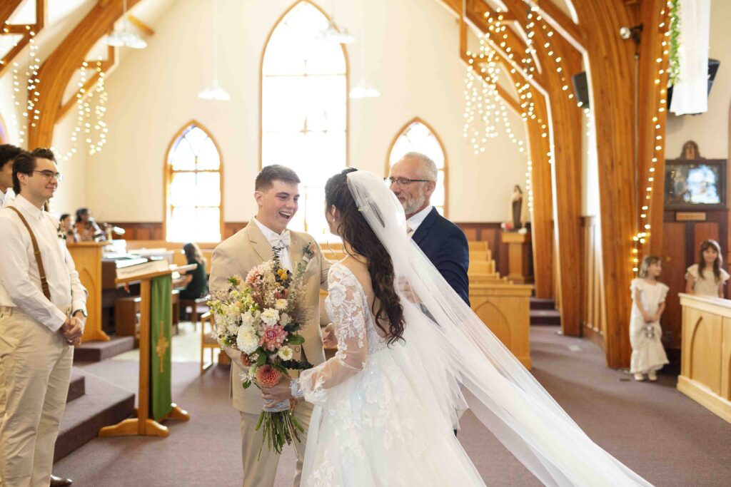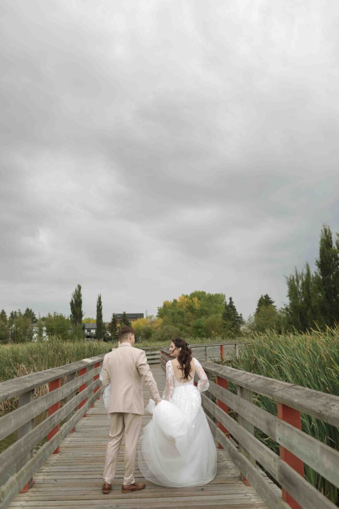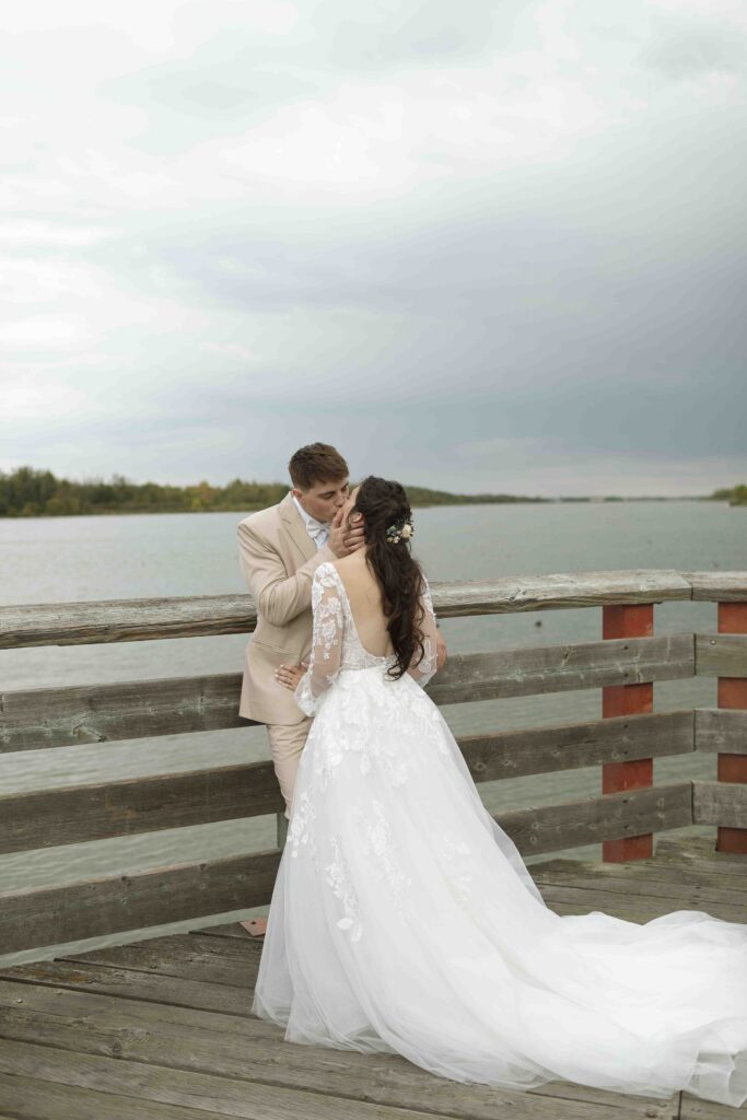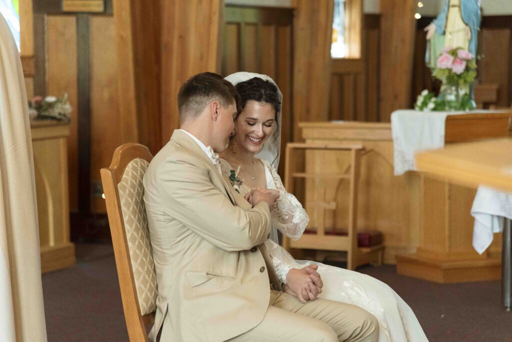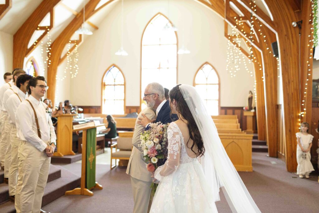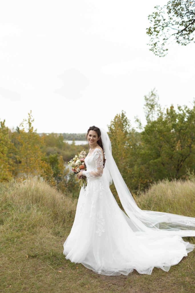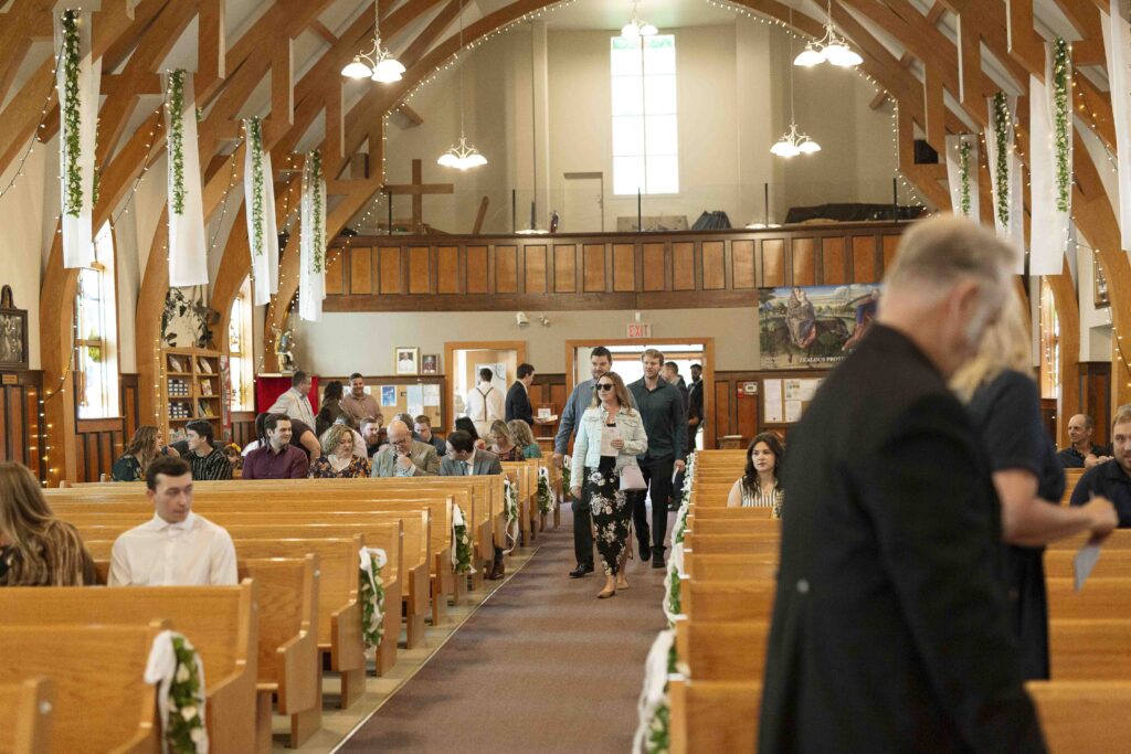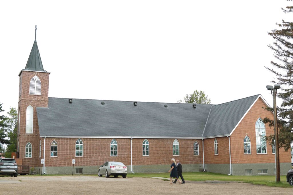 Lydia and Tim got married on a somewhat overcast, somewhat rainy, and completely perfect September day. The ceremony took place at St. Michael’s Catholic church in Leduc, Alberta. The beautiful little church sits right next to Telford Lake, making their wedding feel like something out of a romance movie.